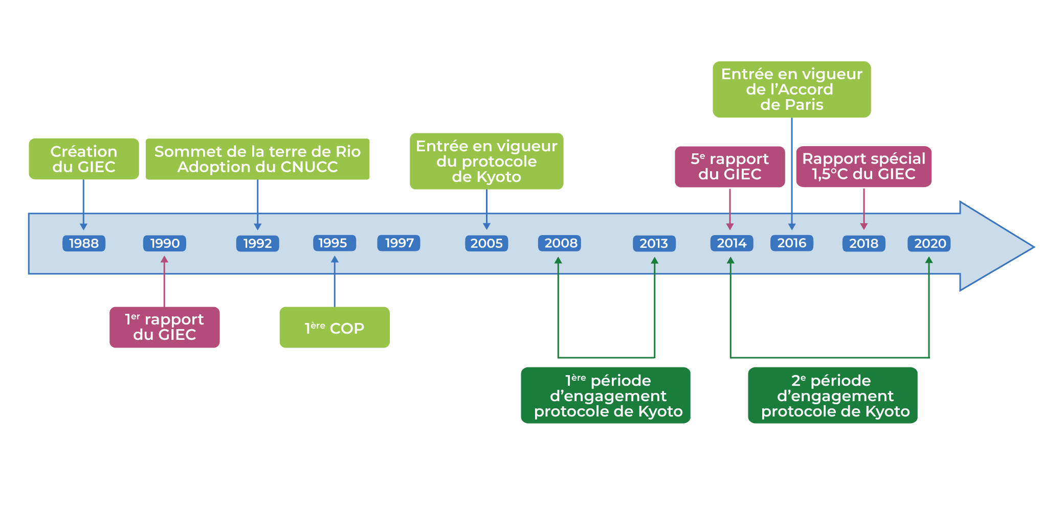 Le Protocole de Kyoto a été le premier résultat des négociations internationales sur le climat. Signé en 1997, il est entré en vigueur en 2005, et fixe aux pays signataires des objectifs contraignant de réduction des émissions de GES d’environ 5 % entre 2008 et 2013 (première période d’engagement du protocole). Ratifié par la France en 1998, il a été prolongé en 2012 pour une seconde période d’engagement de 2013 à 2020.