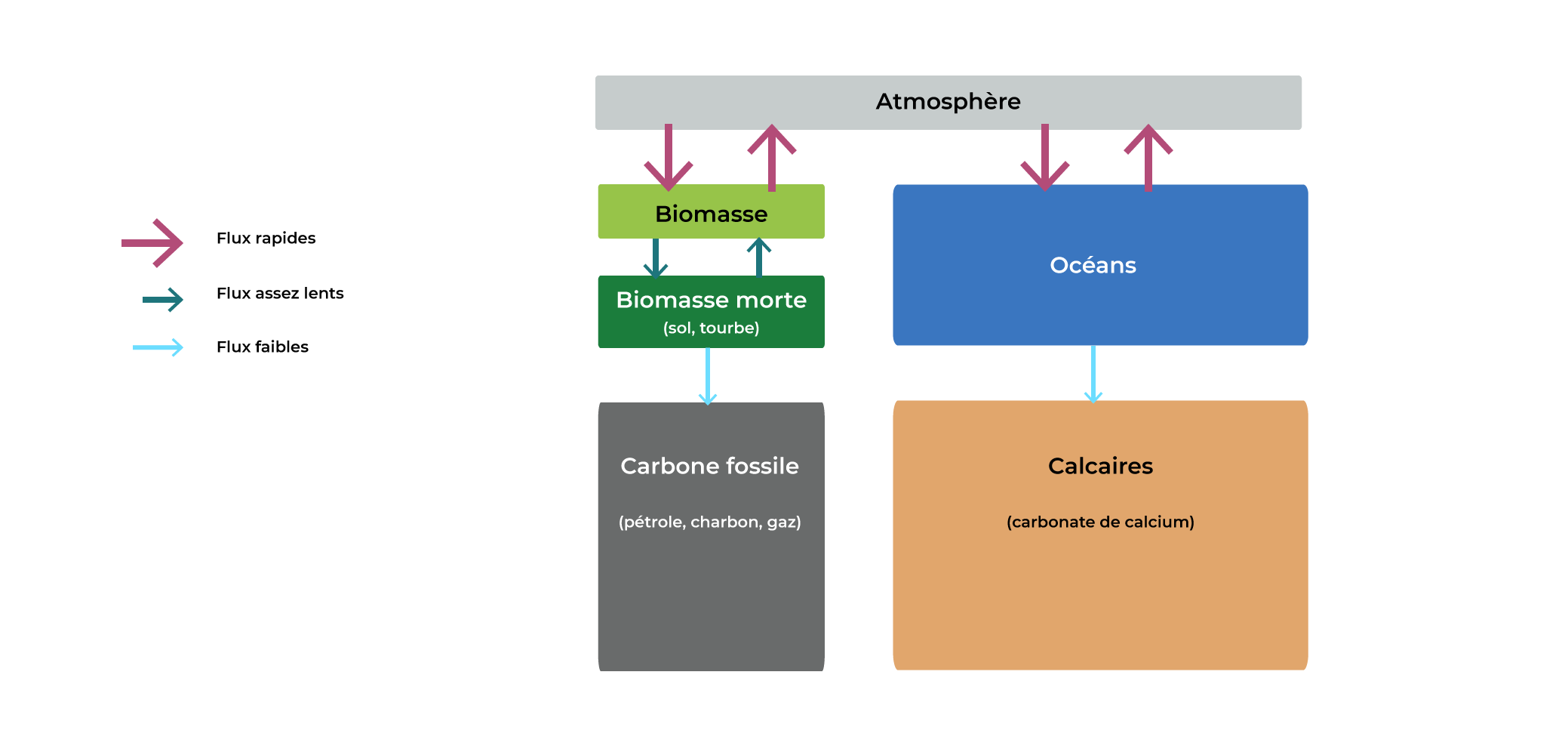 Schéma simplifié du cycle du carbone montrant les flux entre les stocks biologiques et géologiques de carbone