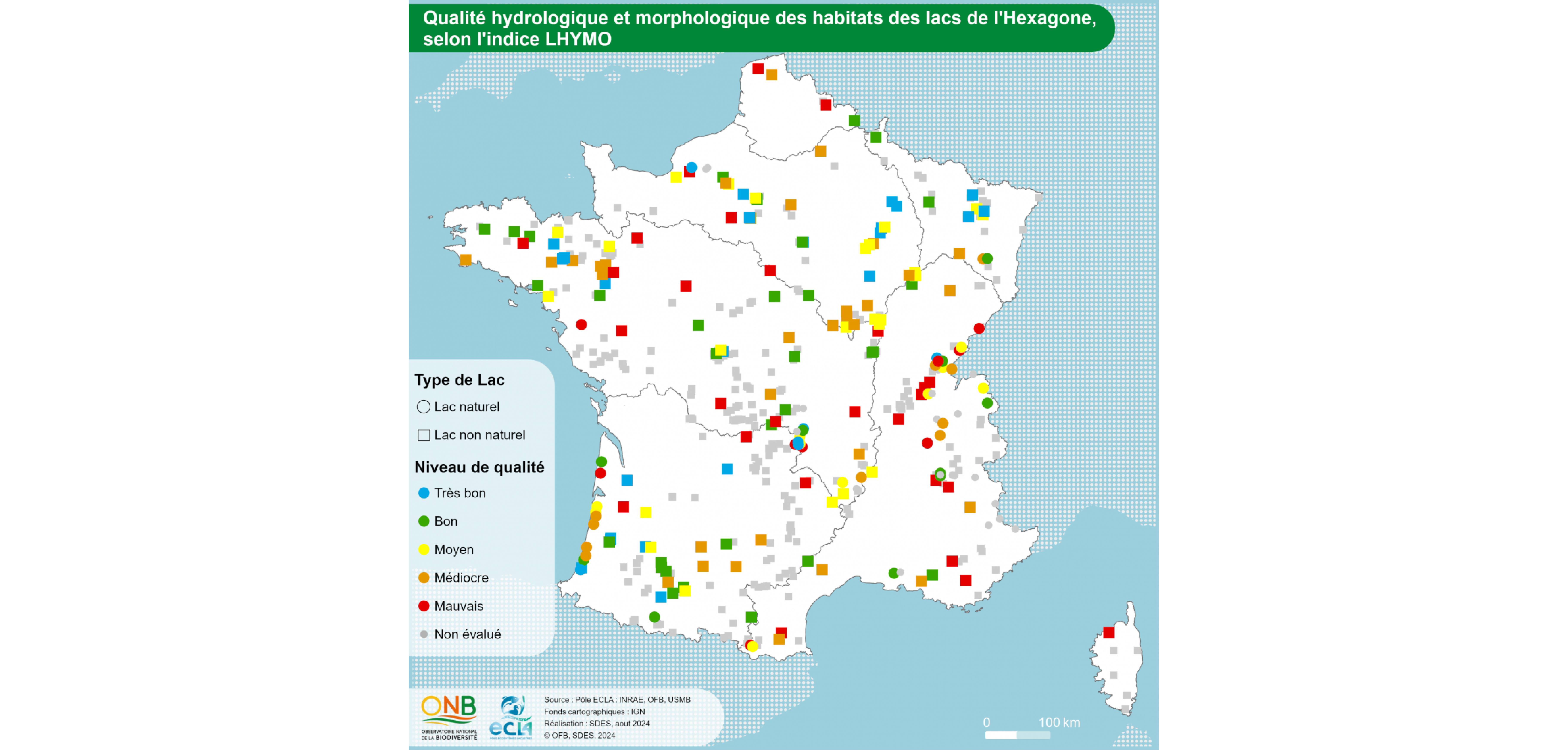 Source : indicateur ONB : Qualité hydrologique et morphologique des lacs français (naturefrance)