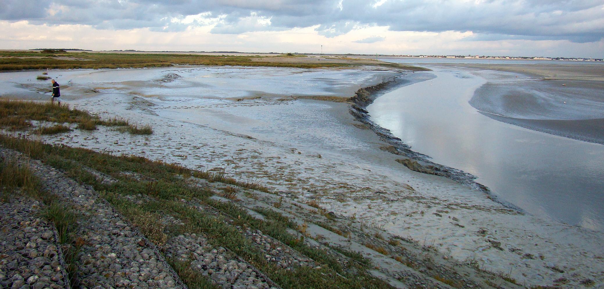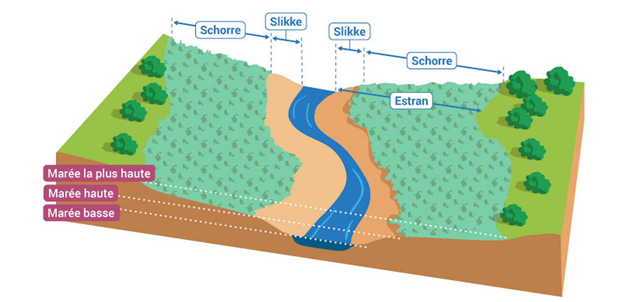 L’estran est la partie du rivage qui est immergée à marée haute et découverte à marée basse. Les zones les plus basses de l’estran, recouvertes à chaque marée, constituent la slikke. Elle est formée de vasières dont les sédiments sont remis en suspension à chaque inondation. Cette instabilité du substrat, couplée à l’abondance de particules en suspension et aux courants générés par les marées, empêche l’installation de végétaux et d’algues.