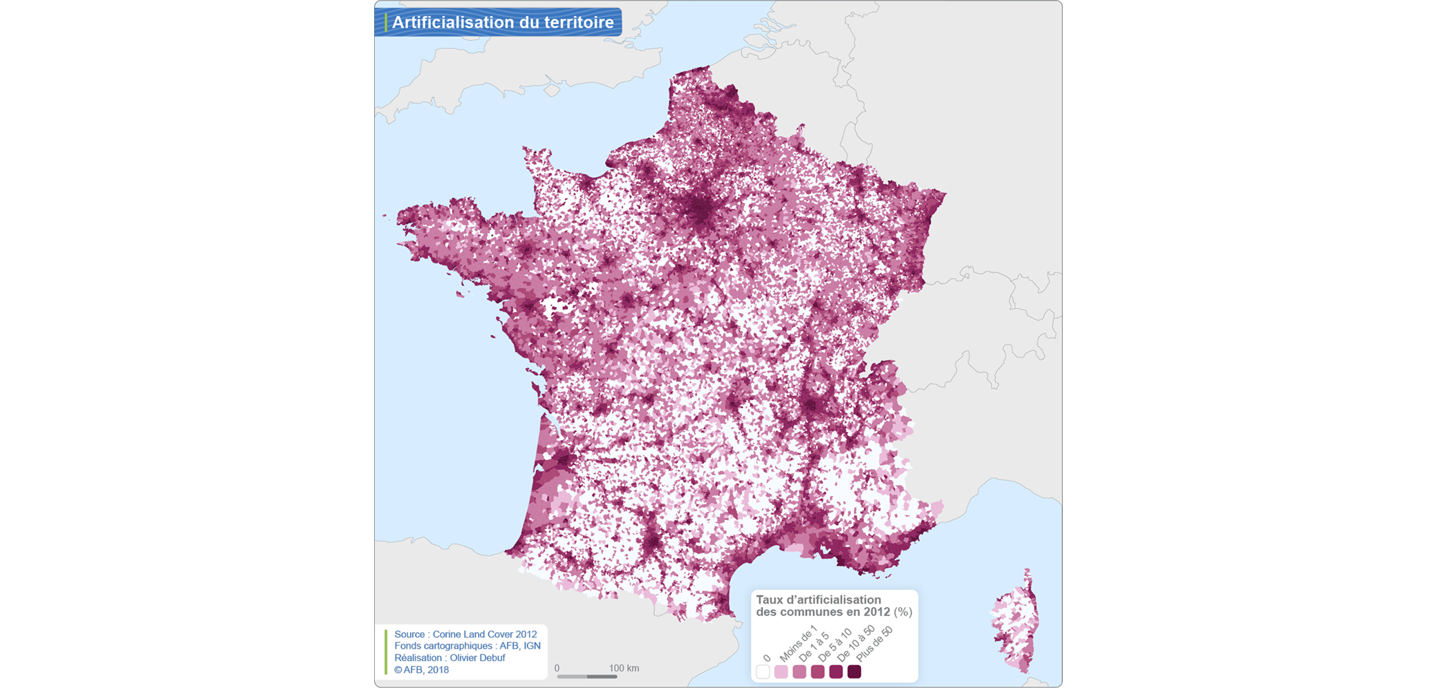 Il est difficile de mesurer précisément les surfaces artificialisées, mais les estimations varient entre 5 et 10% du territoire métropolitain (d’après SDES). Ces estimations montrent également qu’entre 1981 et 2012, 180 hectares de sols, en moyenne, ont été artificialisés chaque jour, soit un peu plus de 250 terrains de football.