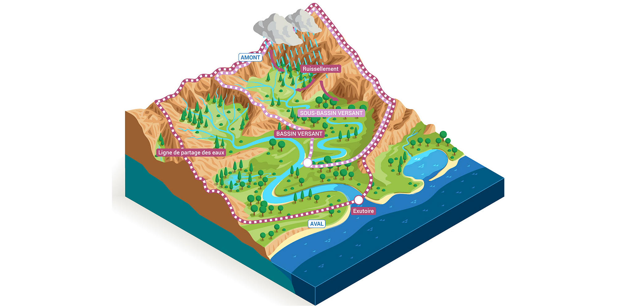 Apportée par les pluies, l’eau s’écoule au travers de différents milieux aquatiques - cours d'eau, lacs, étangs, milieux humides, estuaires ou lagunes - avant de rejoindre l’océan.