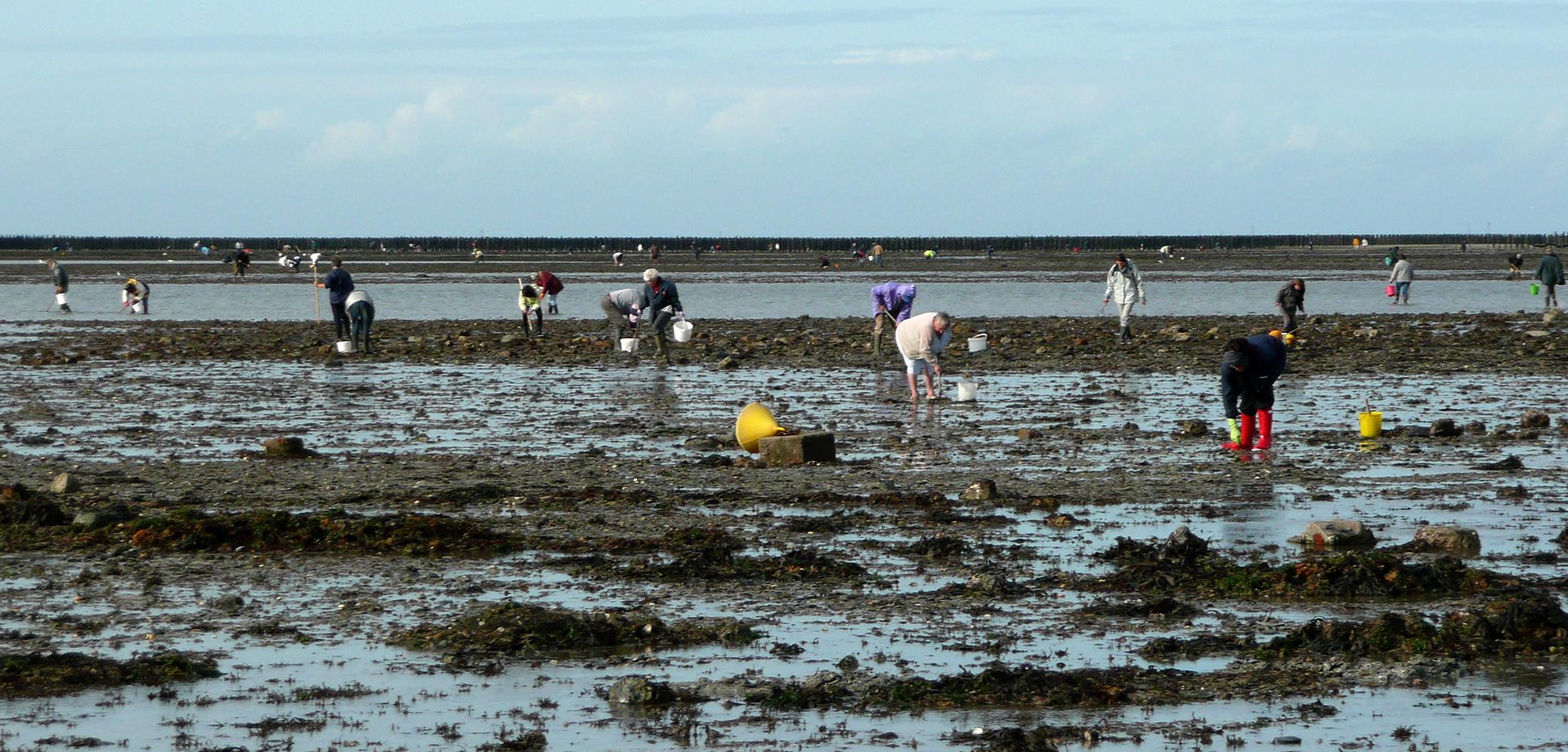Pêcheurs à pied de moules au Portel et nuée de goélands