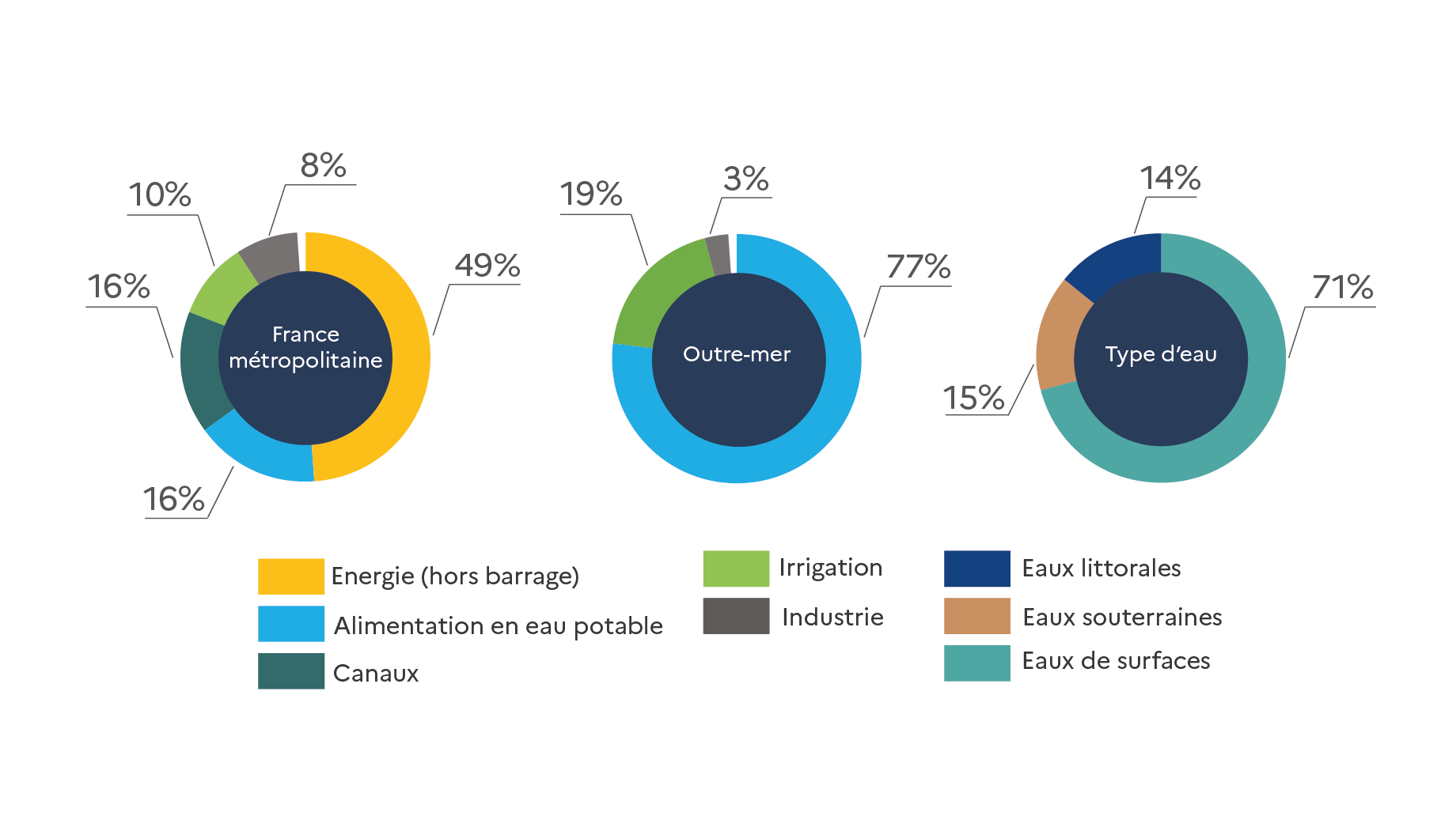 Par exemple sur les 38,4 milliards de mètres cubes prélevés en 2013, plus de la moitié (21 milliards de mètres cube) est destinée à la production d’énergie (principalement le refroidissement des centrales thermiques classiques ou nucléaires - 54,7%), 5,5 milliards à l’alimentation en eau potable (14,3%), 2,8 milliards à l’agriculture (principalement l’irrigation - 7,3%), 3 milliards à l’industrie (7,8%), mais également 5,5 milliards à l’alimentation des canaux (14,3%). Au total 34,4 milliards de mètres cubes d’eau douce et 4 milliards de mètres cubes d’eau saumâtre ont été prélevés.