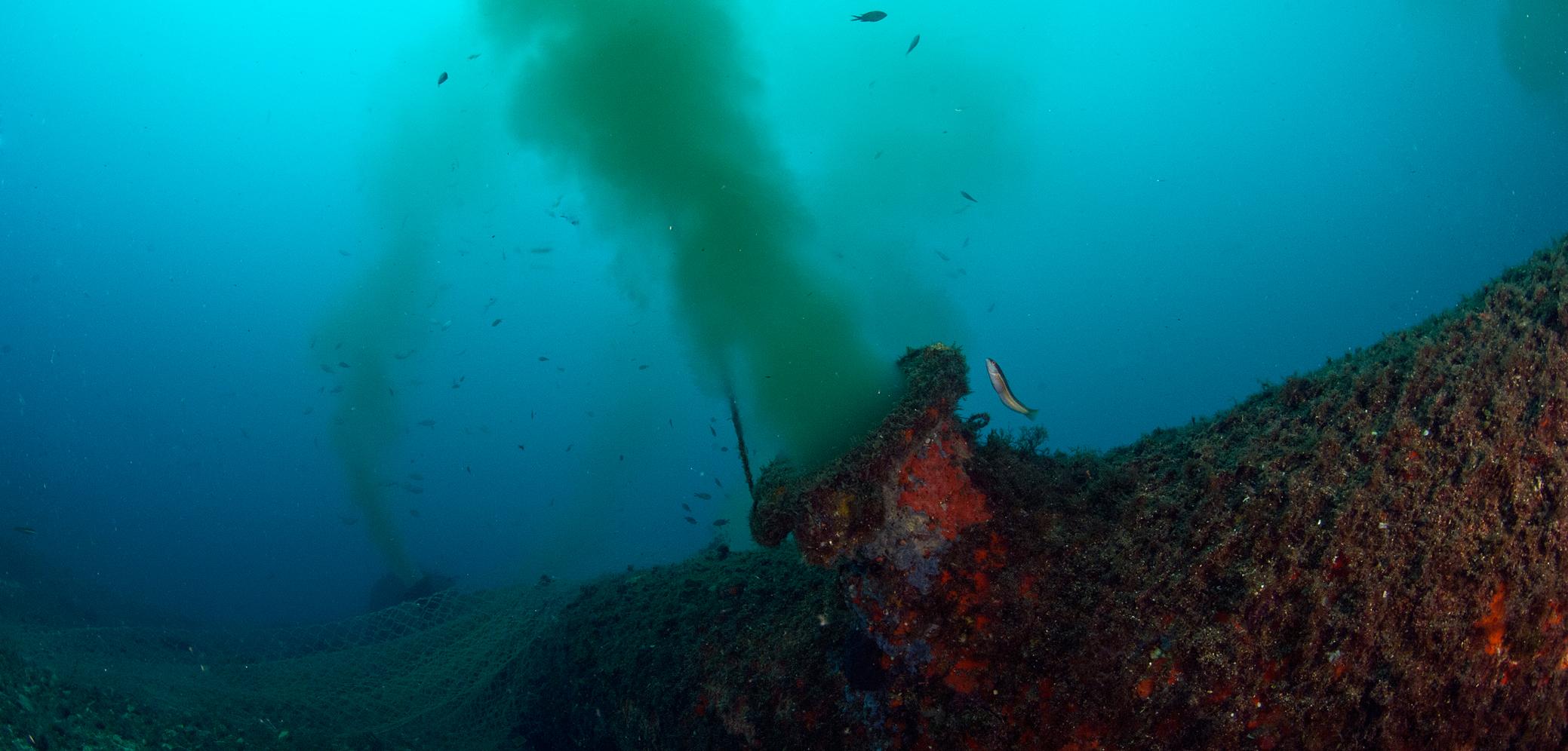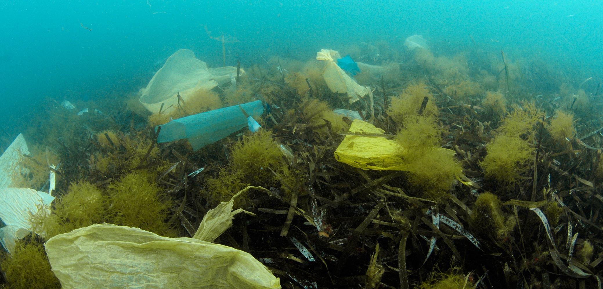 Déchets plastiques contaminant un herbier de posidonies (Posidonia oceanica) et algues (Dictyota sp.)