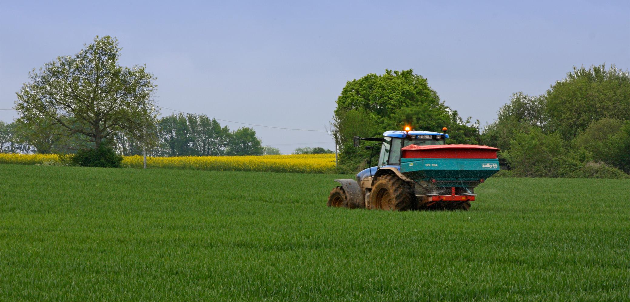 Épandage d'engrais sur un champ de blé, bassin versant Magnerolles, Deux Sèvres