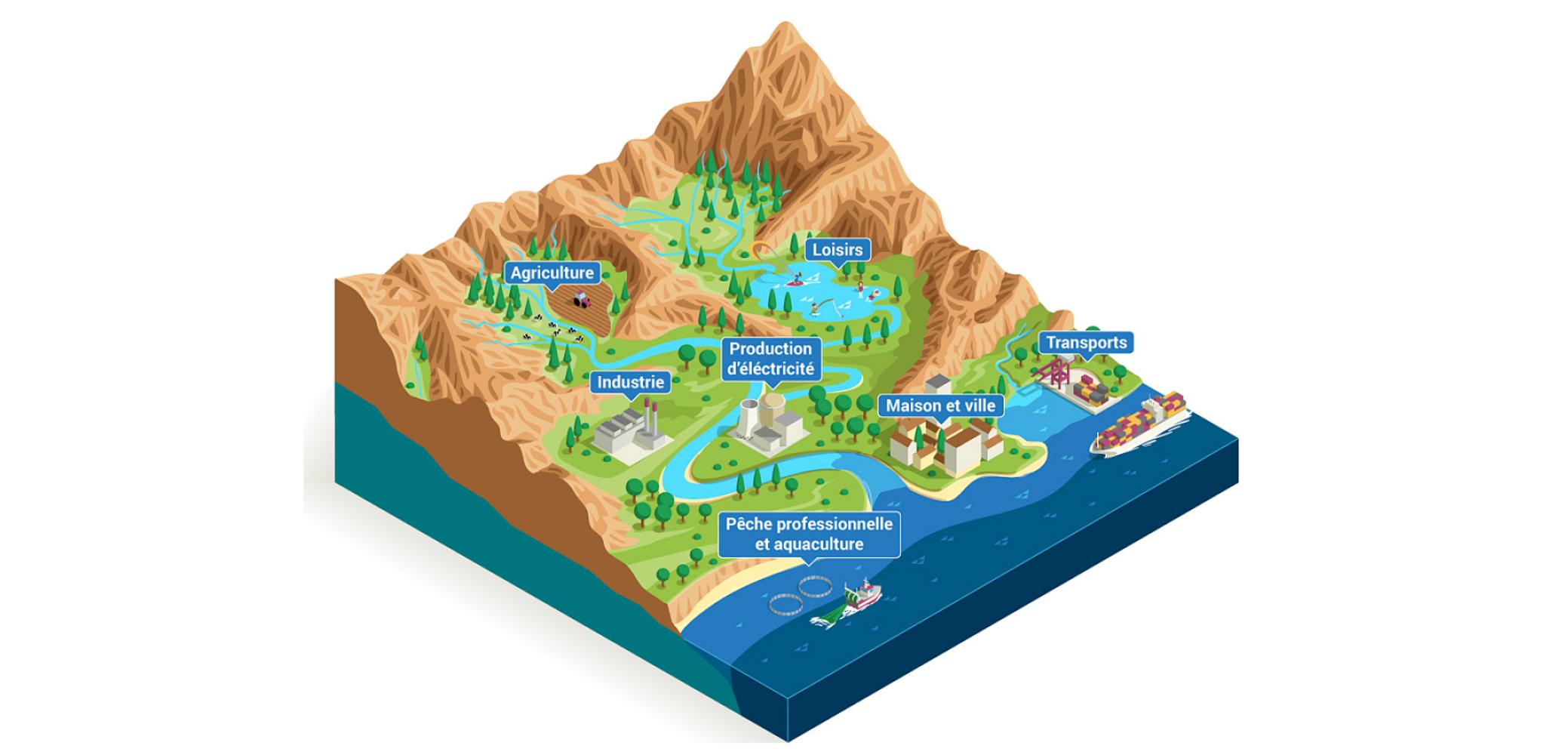 Les activités humaines sont liées aux milieux aquatiques, qu’il s’agisse de rivières, de lacs, de milieux humides ou d’autres écosystèmes. L’eau y est prélevée pour de nombreux usages, avant d’être rejetée en partie dans la nature. Certains usages dépendent du milieu tout entier : pêche professionnelle, transport fluvial et maritime, activités de loisirs, etc.