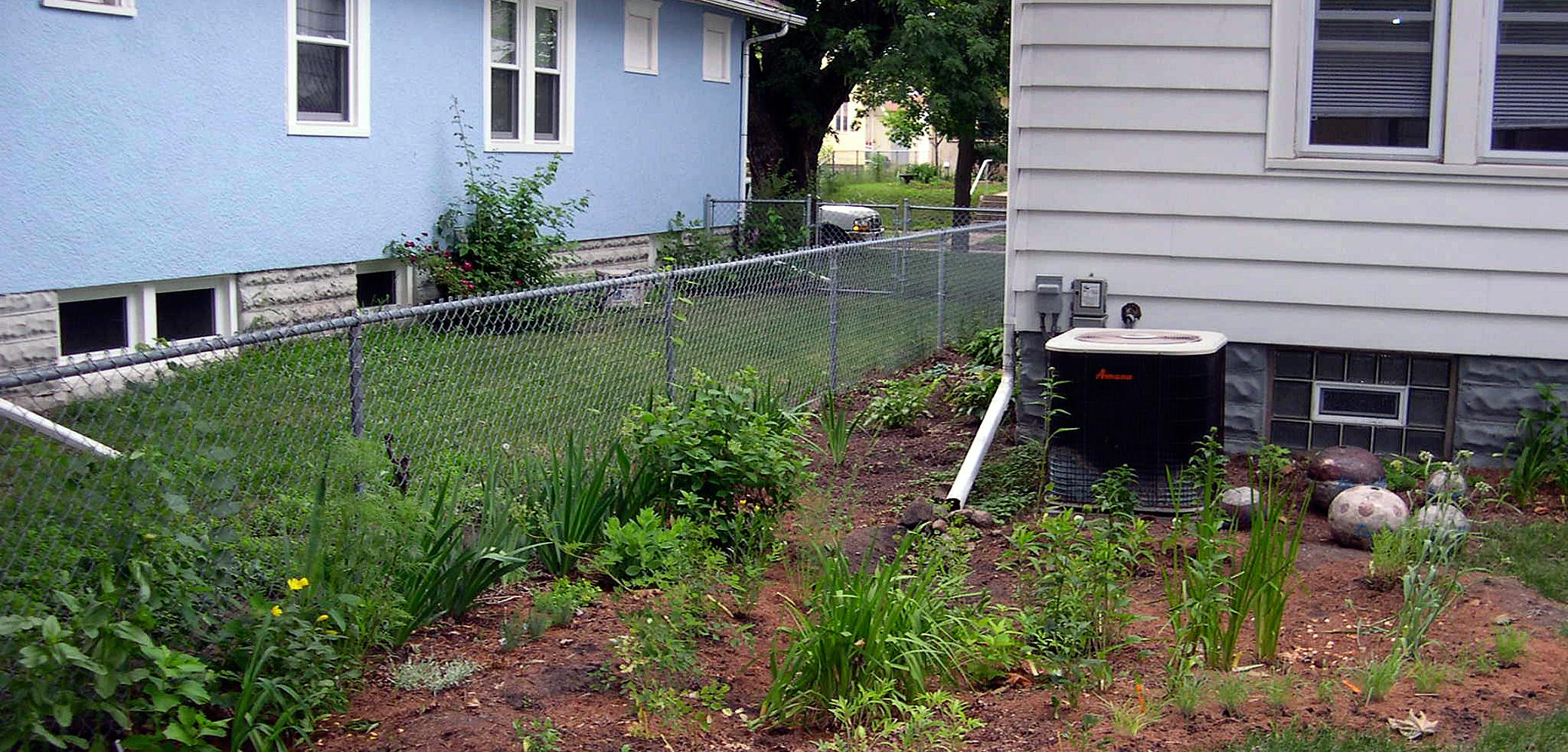 Jardin pluvial en construction à partir des eaux de trop plein d'un bac de récupération des eaux pluviales