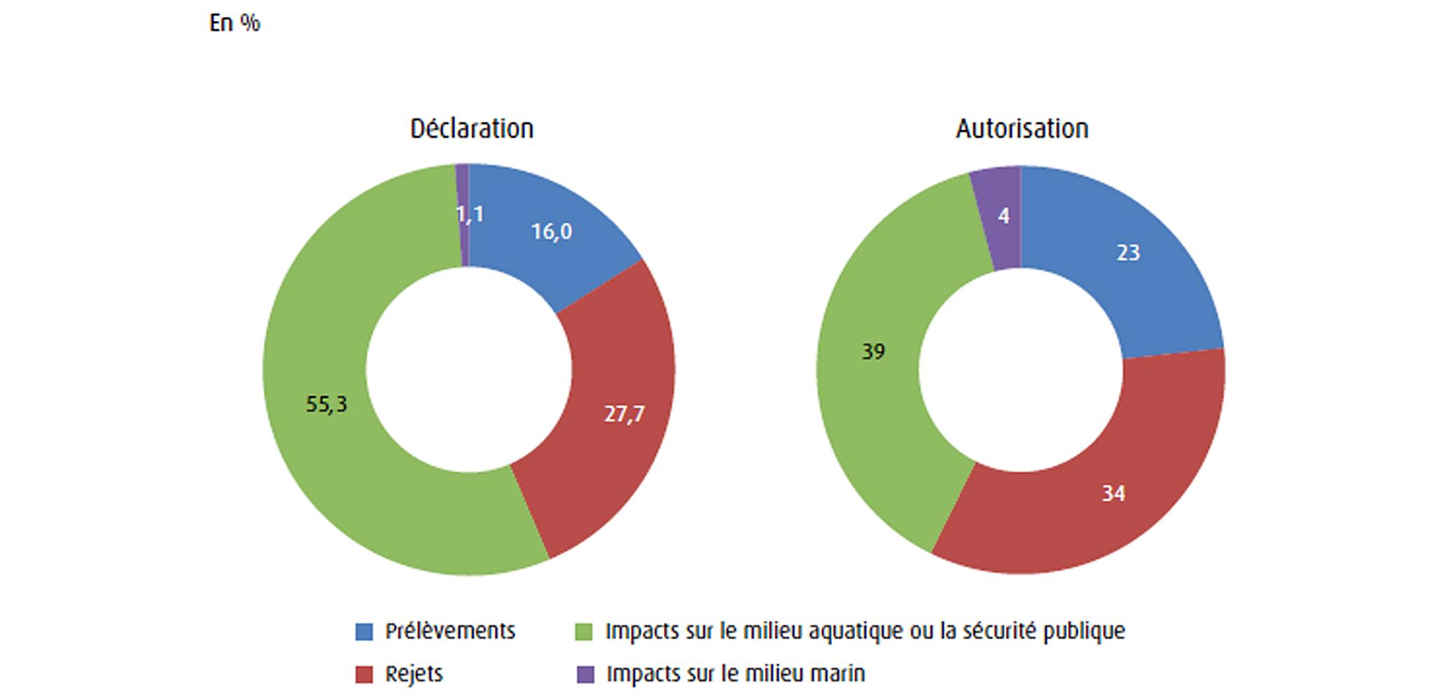 Selon les dangers qu’ils représentent et la gravité des effets potentiels sur la ressource en eau et les écosystèmes, les installations, ouvrages, travaux et activités sont soumis à une procédure simplifiée de déclaration auprès des services de l’État ou à autorisation après enquête publique. Le nombre de dossiers instruits est stable depuis 2008. De 1 000 à 1 200 dossiers par an sont soumis à autorisation et 10 fois plus à déclaration. La nature des opérations concernées est également stable. Les impacts sur les milieux aquatiques ou la sécurité publique sont prépondérants parmi les déclarations. Les autorisations sont plus équitablement réparties entre les impacts sur les milieux aquatiques ou la sécurité publique, les rejets et les prélèvements.