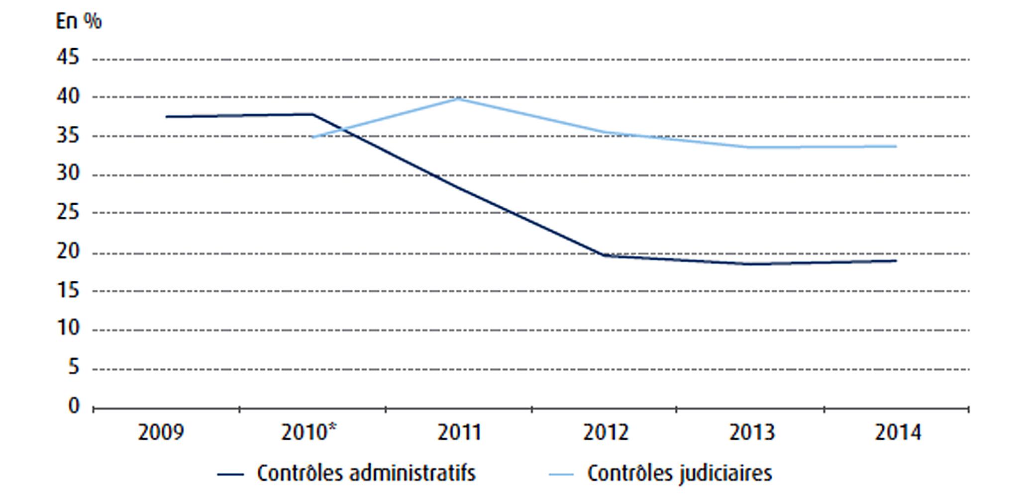 Notes : la police administrative porte sur le respect du régime administratif alors que la police judiciaire porte sur les infractions à la loi pénale. La police administrative de l’environnement comprend les contrôles réalisés par les DDT(M) avec l’appui technique de l’Onema. La police judiciaire de l’environnement est exercée sous la direction du procureur de la République par les officiers, fonctionnaires et agents désignés par le Code de procédure pénale : l’Onema est le principal opérateur sur le terrain dans le domaine de l’eau ; *en 2010, contrôles administratifs uniquement sur site et non sur dossier et sur site.
