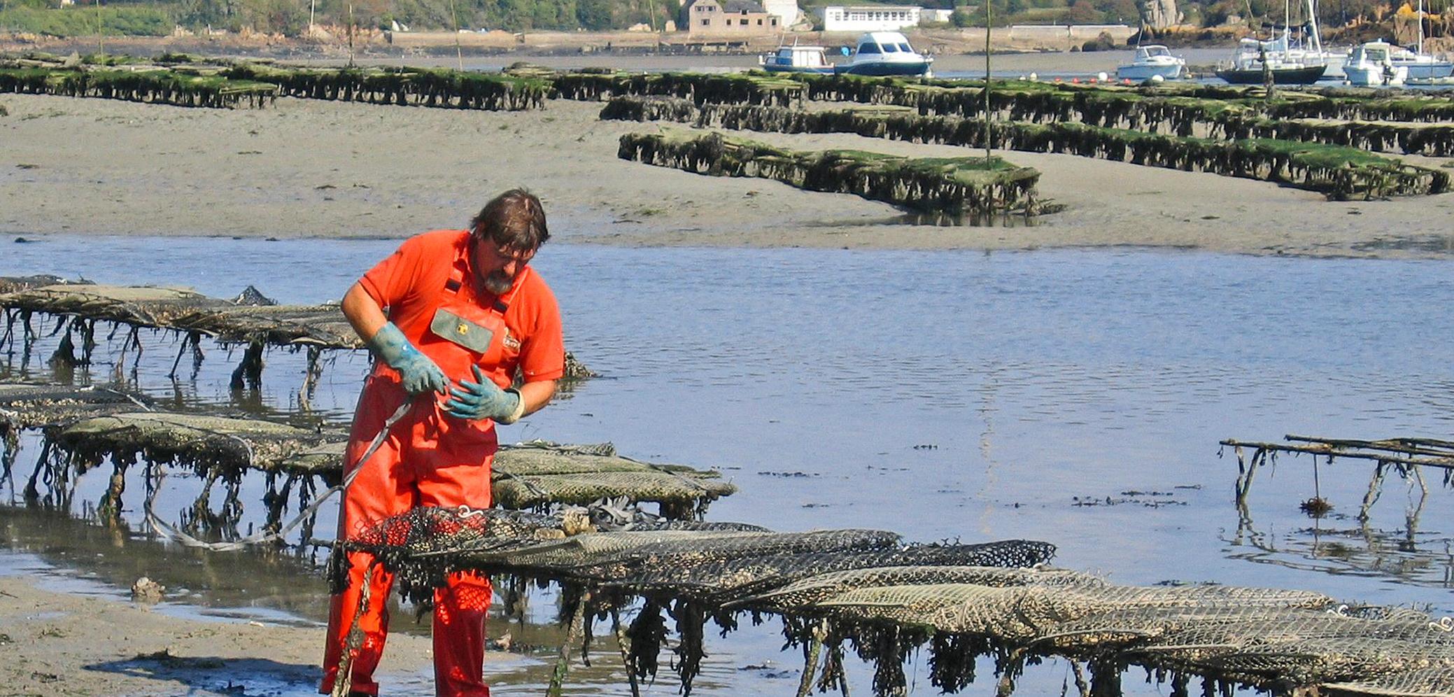 Ostréiculteur devant des sacs de grossissement des huîtres, Belon, Bretagne